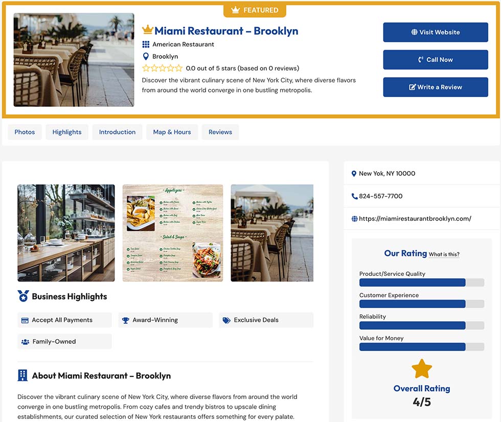 – Details & Highlights: Read about the business in the “About” section and view key highlights like “Award-Winning” or “Exclusive Deals.”